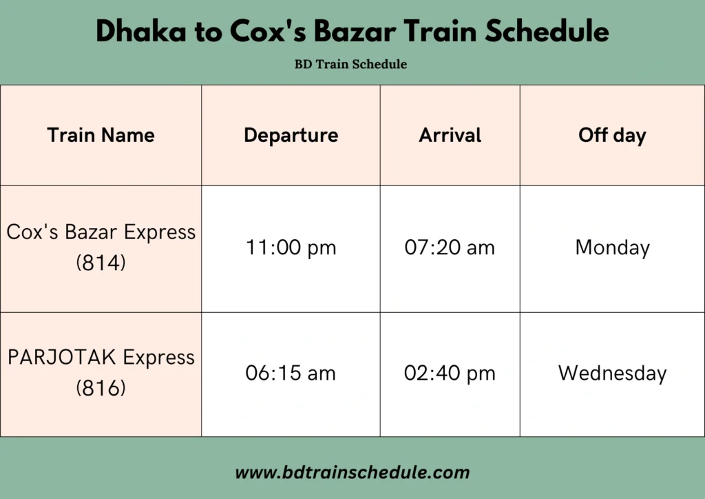 - কক্সবাজার এক্সপ্রেস (ট্রেন নং ৮১৪): প্রতিদিন (সাপ্তাহিক বন্ধ: সোমবার) রাত ১১:০০ মিনিটে ঢাকা কমলাপুর রেলওয়ে স্টেশন থেকে ছেড়ে যায় এবং কক্সবাজার রেলওয়ে স্টেশনে পৌঁছায় সকাল ৭:২০ মিনিটে।